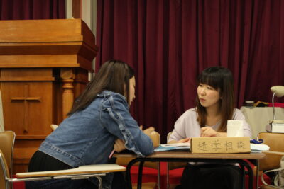留学生支援 進学・進路相談 留学生支援 進学・進路 相談 進学や就職の進路に悩んでいる留学生たちのために、バザーの時に会場の一部を借りて、進学・就職相談コーナーを設けています。相談者として、博士課程に在籍している留学生、すでに就職した元留学生たちがボランティアとして来てくださり、色々とサポートをしてくださっています。さらに、就職相談は実際、就職相談に係わっているジョブパークの相談職員の方に来ていただき、履歴書の自己アピールの書き方からはじめ、外国人としてどのように面接マナーを守るべきか、話し方、挨拶はどのように注意するべきか等々の事例をあげて教えてくださいます。毎年のバザーの日程に合わせて設けられています。 留学生支援 進学・進路相談 留学生支援 進学・進路 相談 進学や就職の進路に悩んでいる留学生たちのために、バザーの時に会場の一部を借りて、進学・就職相談コーナーを設けています。相談者として、博士課程に在籍している留学生、すでに就職した元留学生たちがボランティアとして来てくださり、色々とサポートをしてくださっています。さらに、就職相談は実際、就職相談に係わっているジョブパークの相談職員の方に来ていただき、履歴書の自己アピールの書き方からはじめ、外国人としてどのように面接マナーを守るべきか、話し方、挨拶はどのように注意するべきか等々の事例をあげて教えてくださいます。毎年のバザーの日程に合わせて設けられています。